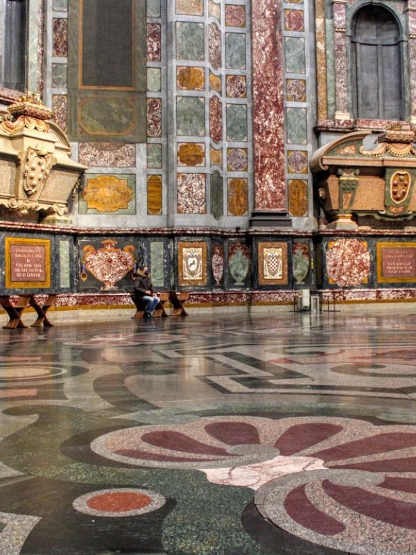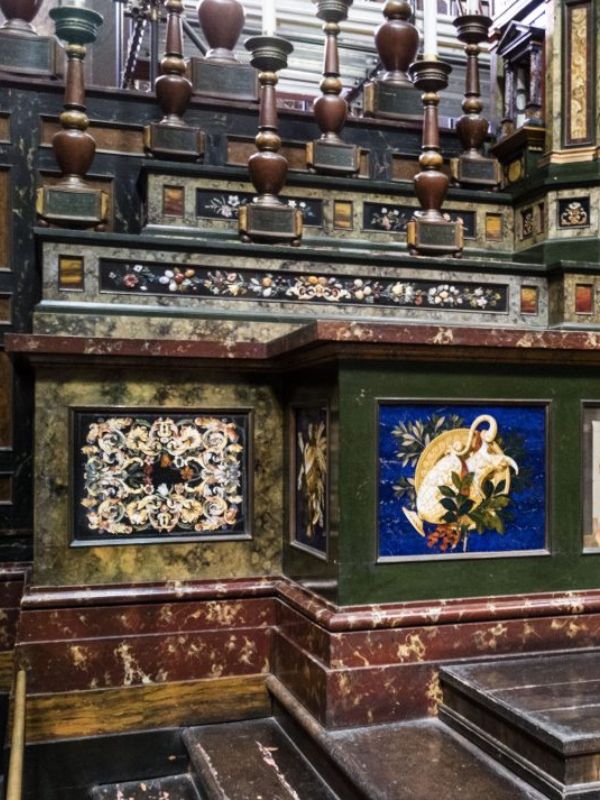 All’Opificio delle Pietre Dure artigiani altamente specializzati si dedicavano alla realizzazione di opere straordinarie: tavoli, pannelli decorativi, arredi e rivestimenti architettonici. Uno dei progetti più ambiziosi è la Cappella dei Principi nella Basilica di San Lorenzo, dove le superfici sono interamente rivestite da intarsi in pietre policrome provenienti da tutto il mondo.