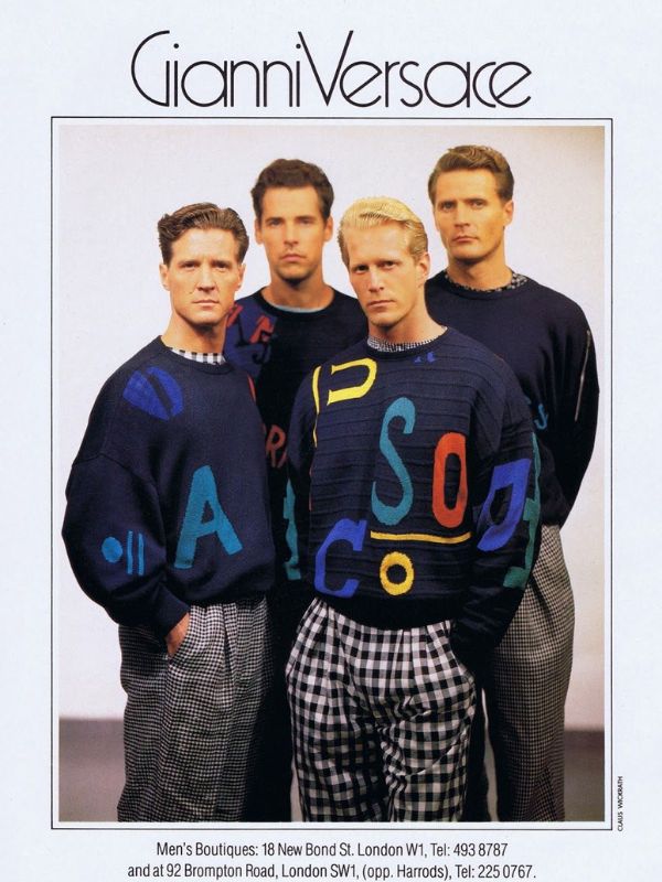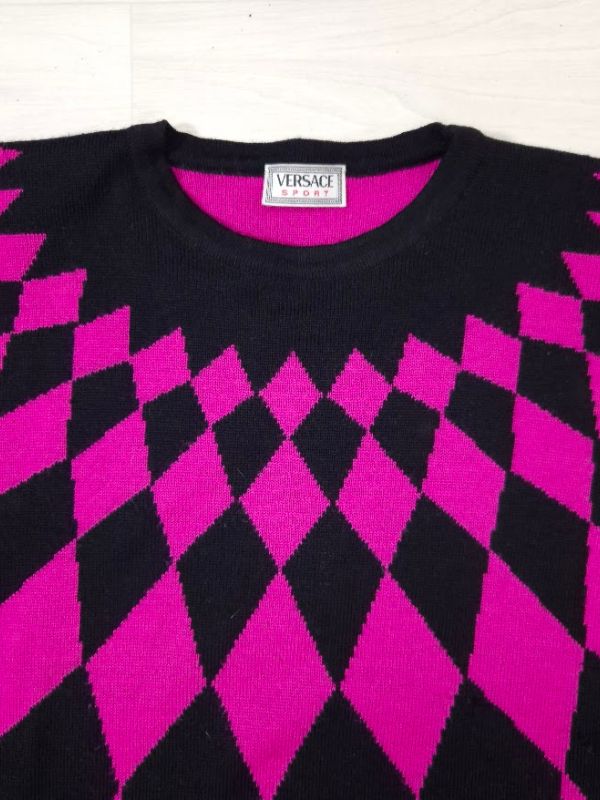 Da ricordare la collezione autunno-inverno 1986-87 che presenta in passerella look dai pattern audaci e vibranti, giocati su motivi optical che richiamano l’estetica Op Art. I maglioni vintage di Versace in questi anni rispecchiano questa ricerca di dinamismo e impatto visivo: spesso presentano pattern geometrici dinamici, spirali, righe optical e blocchi di colore che disegnano la forma del corpo. Ne è un esempio il maglione Versace Sport in vendita sul nostro shop, tutto giocato sul contrasto nero-rosa.