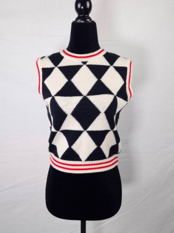 Il gioco di geometrie torna con forza anche negli anni Novanta e in particolare nella collezione autunno-inverno 1995, dove il contrasto bianco e nero prende vita in un pattern di triangoli, come nel gilet in lana firmato firmato Gianni Versace Couture.
