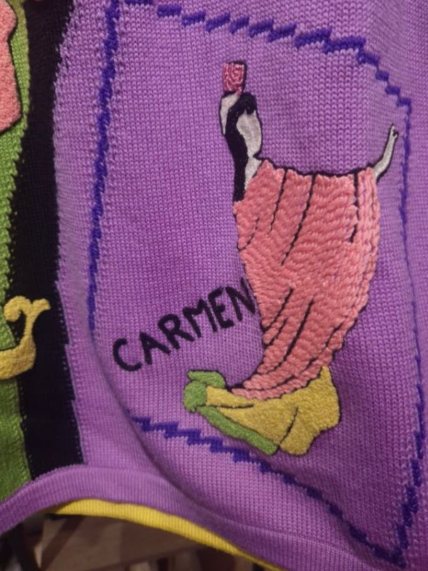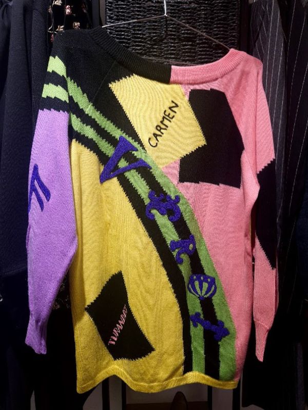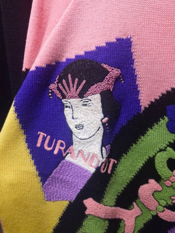 Si tratta di un capolavoro di maglieria dove l’estetica degli anni 80 entra nel decennio successivo e da vita ad un maglione ispirato alla grande tradizione dell’Opera che rende omaggio in particolare a Giacomo Puccini.