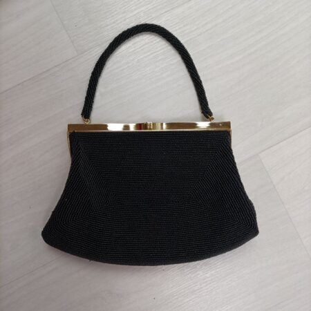 Straordinaria borsetta da sera interamente ricamata in perline. Vintage anni 50 con chiusura a scatto in madreperla. Manico corto per portarla a mano o al braccio, anche il manico รจ realizzato in perline. Di colore nero.