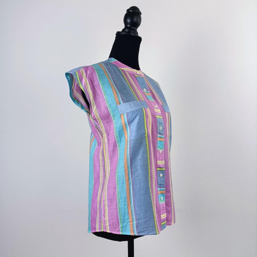Camicia donna vintage a righe in delicati colori pastello, maniche ad aletta e senza colletto; con due tasche sul petto.