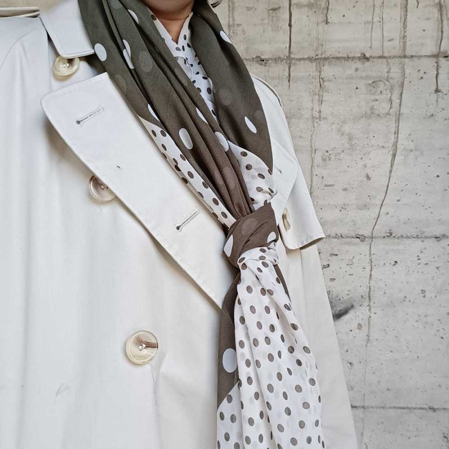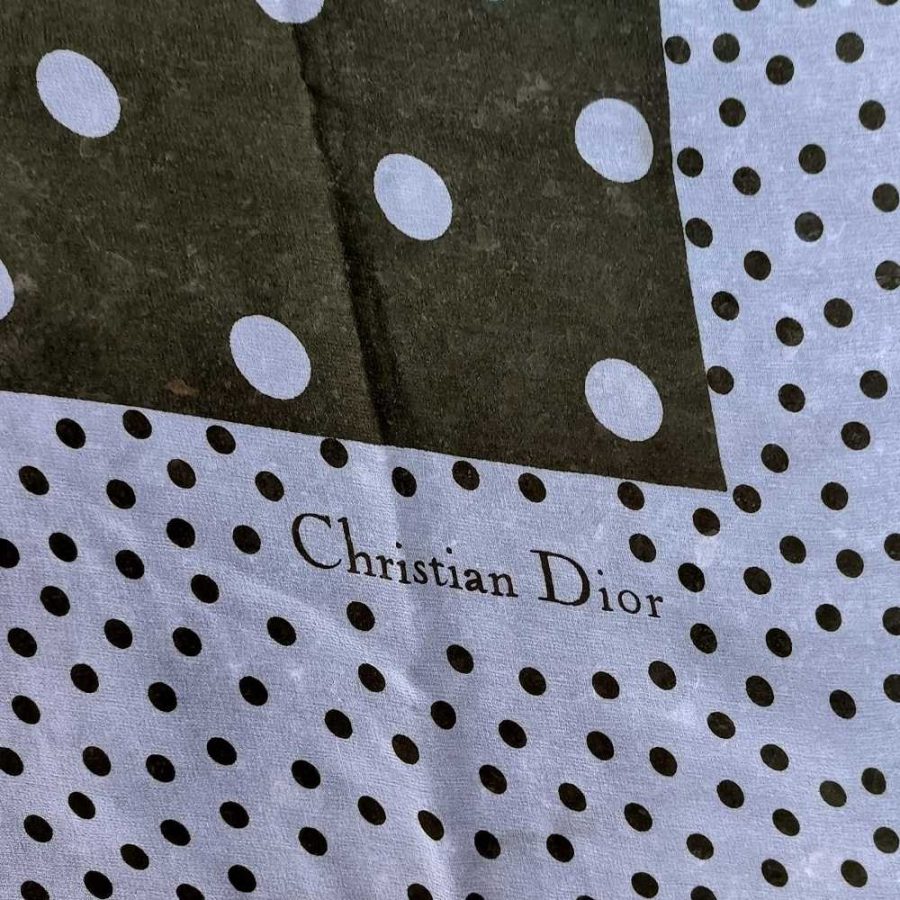 Maxi foulard in seta Christian Dior vintage anni Ottanta con fantasia di pois, verdi oliva su fondo bianco e bianchi su fondo verde oliva.