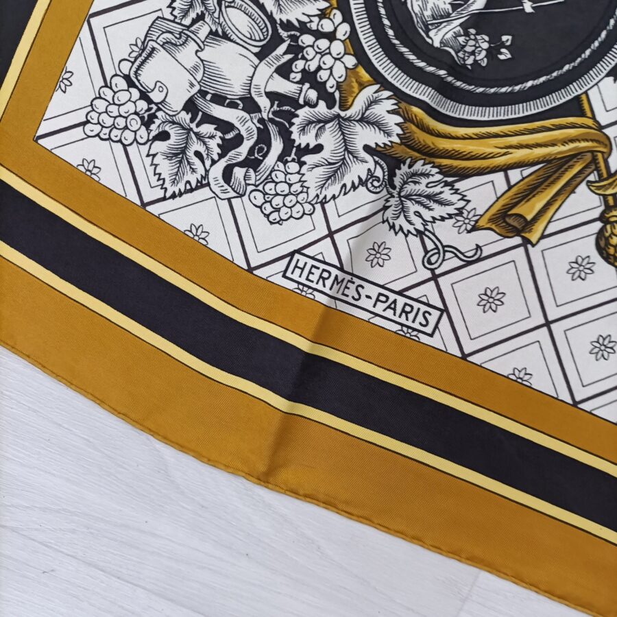 ABOUT | Foulard Hermès La Treille di Maurice Tranchant, anno 1964, anche noto come Hussard et Cantinier. E’ un foulard molto raro, una prima edizione in ottime condizioni. Al centro del carre è rappresentato un ussaro francese napoleonico dell’inizio del XIX secolo sul suo destriero e una vivandiera al suo fianco. I medaglioni negli angoli mostrano le varie fasi del processo di vinificazione dalla piantagione della vite alla spillatura. Foulard Hermes in pura seta, bordo giallo senape. Orlato a mano.