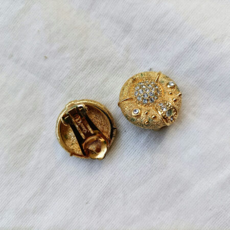 In metallo dorato, hanno un cristallo rotondo centrale circondato da strass più piccoli. Si indossano con clips.