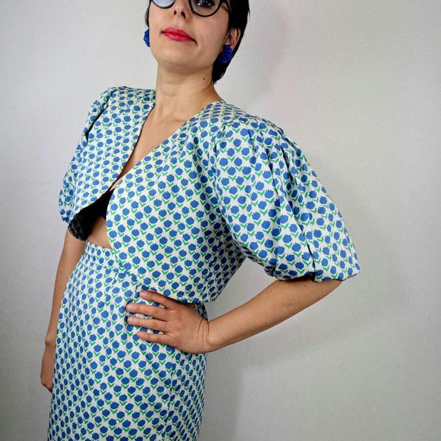 ABOUT | Straordinario completo primaverile della collezione Yves Saint laurent Variation Ss 1991, composto da un bolero dalle ampie maniche a palloncino e gonna a tubin. In ottoman di cotone bianco con fantasia a fiori azzurri stilizzati, molto bon-ton. La giacca corta ha i lembi arrotondati e non ha bottoni. 100% cotone, foderato. Made in Frane
