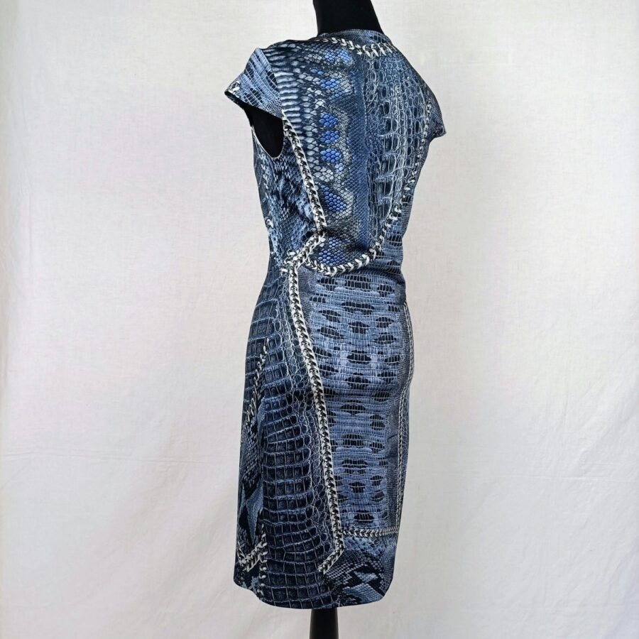 ABOUT | In pieno stile Y2k aesthetic un bel tubino longuette con stampa rettile, firmato Just Cavalli. Il vestito da donna รจ elasticizzato e aderente, accompagna la figura risaltando le forme. Scollo a V e maniche ad aletta. Stampa animalier all-over che riproduce un patchwork di pelle di rettile sui toni del blu. Made in Italy, primi anni Duemila.
