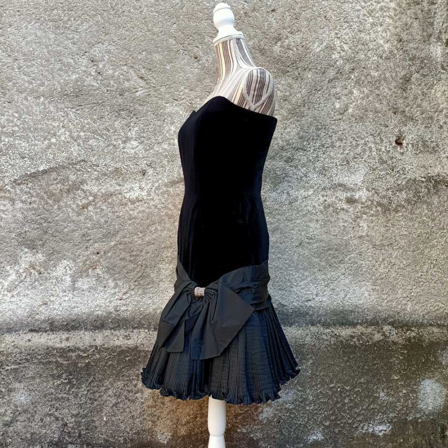 Bellissimo abito da sera di eccellente fattura sartoriale. Elegante scollo a cuore senza spalline; fascia a vita bassa con grande fiocco ornato di strass.