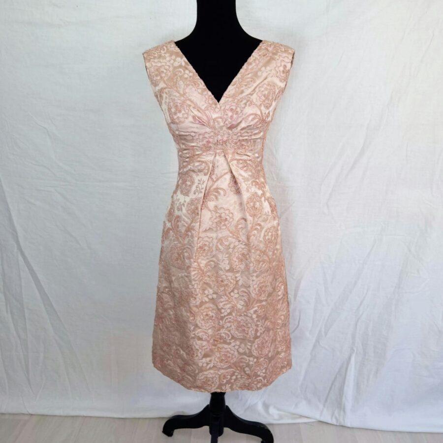 ABOUT | Cocktail dress vintage anni Sessanta, un delizioso vestito di realizzazione sartoriale in raso broccato con ricami in rilievo. Abito con scollo a V, aderente in vita, con una piega centrale e pieghe sulla gonna per dare volume. Foderato; cerniera sulla schiena. Perfetto esempio di stile retrรฒ e bon ton, ideale per una cerimonia.