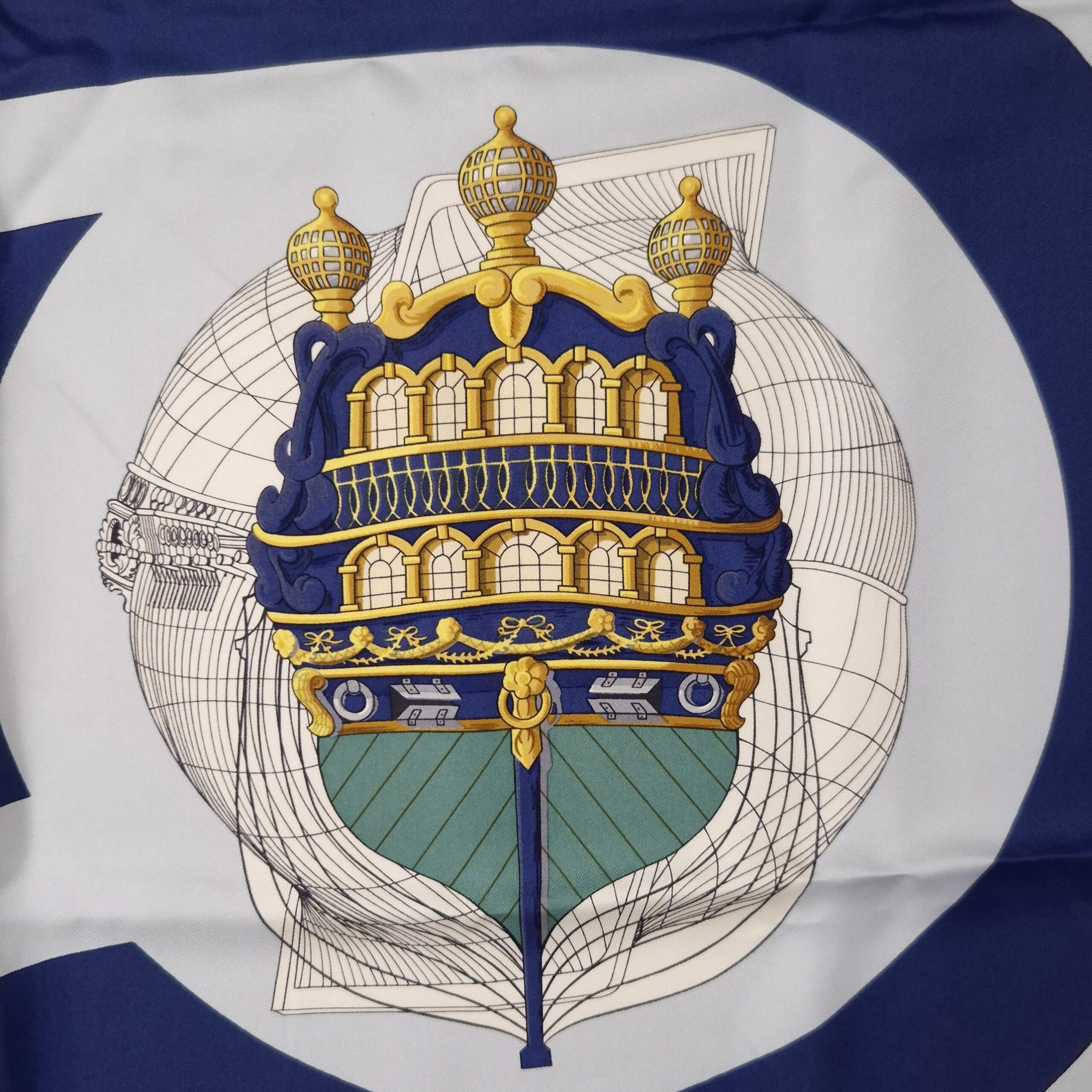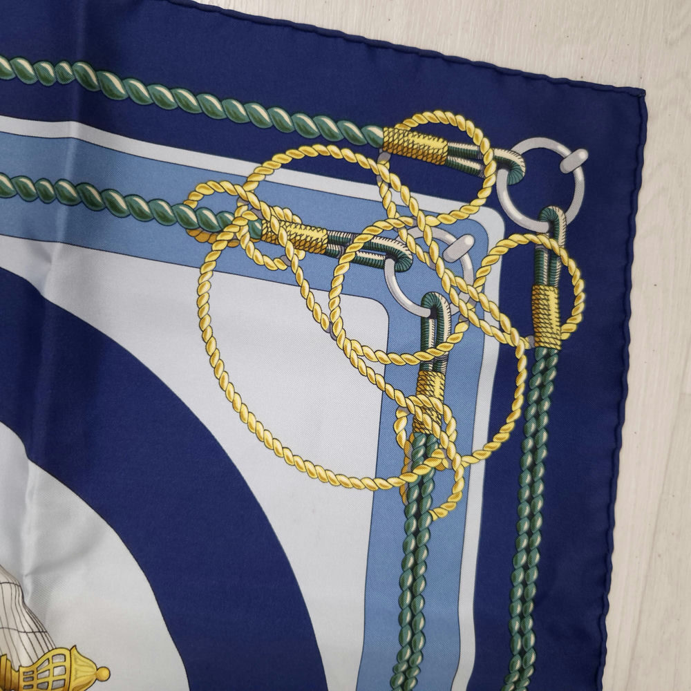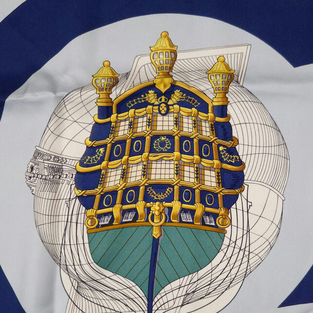 Che navi sono rappresentate? Diversamente da quanto succede in altri foulard a tema navale dal gusto più celebrativo, quelle raffigurate da Julie Abadie non sono navi reali e identificabili; si tratta piuttosto di una composizione decorativa fatta di dettagli architettonici e ornamenti che si intrecciano tra loro. L’effetto è ricco ma equilibrato, perché gli elementi si ripetono creando un ritmo visivo continuo e armonioso.