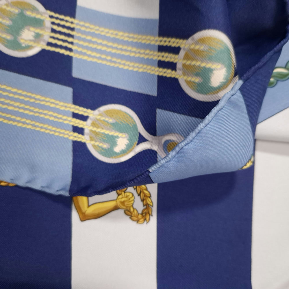 Il carré “Châteaux d’Arrière” è stato stampato per la prima volta nel 1974; alla prima edizione ne sono seguite altre in molte combinazioni di colore. Quello in vendita su Pomella Vintage Shop è un’edizione degli anni Novanta, proposta in una raffinata combinazione di blu, azzurro e giallo oro.